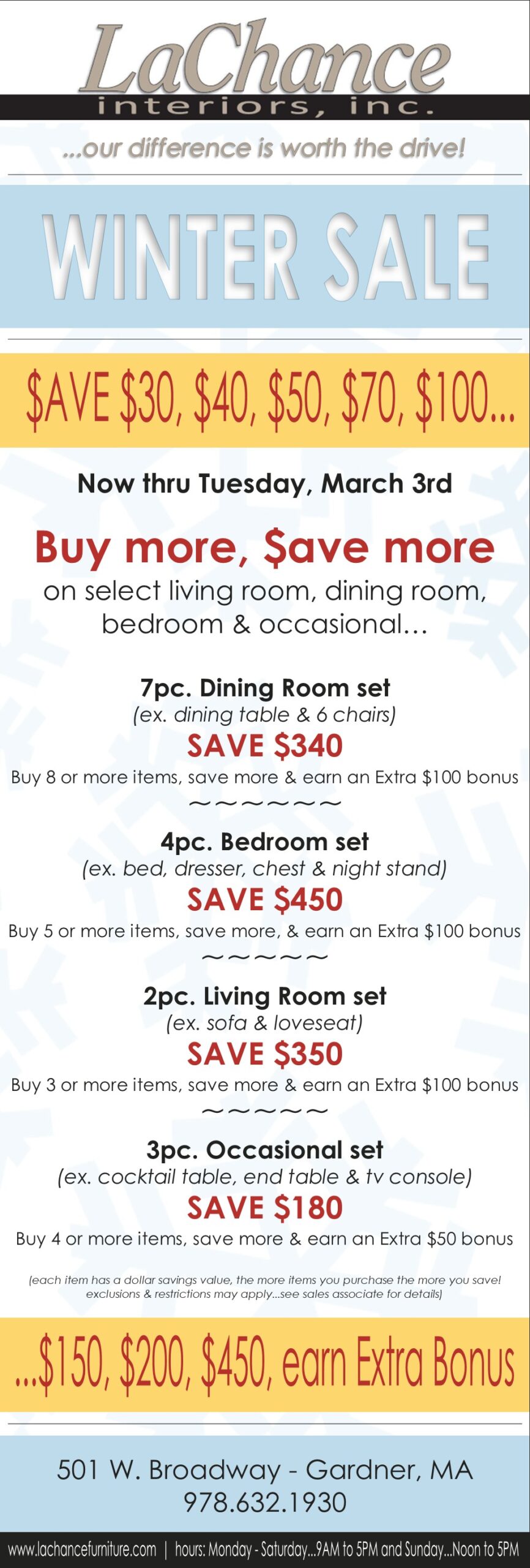 25% OFF ALL PREVIOUSLY MARKED CLEARANCE – FLOOR SAMPLE ITEMS